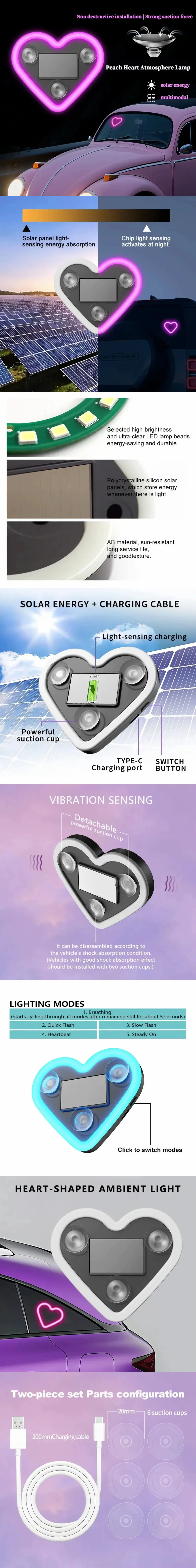 Solar Powered LED Neon Light 🌟Elevate your car's interior with the Solar Powered Wireless LED Heart Shape C-Pillar Neon Light. This unique accessory features a heart design, adding love and atmosphere to your vehicle. It's a creative way to personalize your car's space. Perfect for those who want a unique touch in their vehicle's decoration.Key Features:·Solar Power: Utilizes solar energy, offering an eco-friendly option. 🌞·LED Triangle Design: Provides modern, stylish looks. 💡·Wireless Neon Light: Easy installation without wires. 🔌·Heart Shape: Symbolizes love and affection for your car. ❤️This light is specially designed for car interior lighting. It works with multiple car styles, making it a versatile choice. The heart design ensures your car stands out uniquely. Enhance the ambiance inside your car with this innovative accessory.