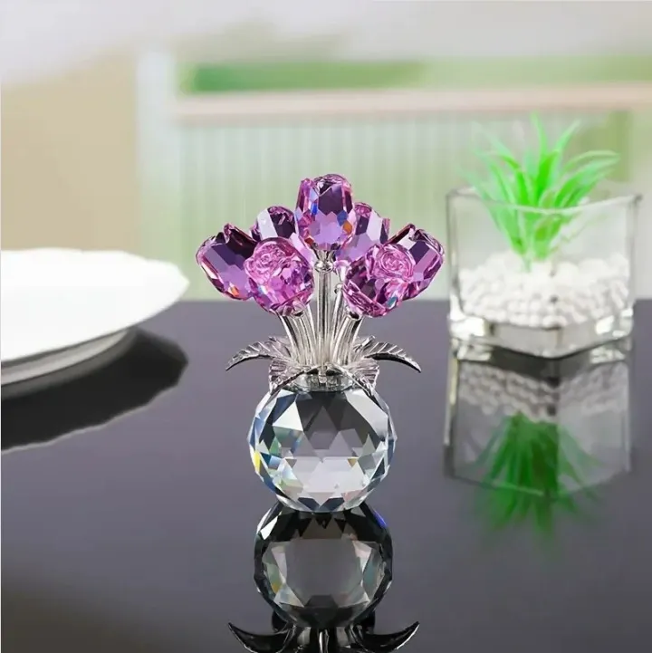 PREMIUM CRYSTAL AND CRAFTS Our Rose Flower Keepsake is made of K9 crystal, without impurities. The crystal at the bottom is polished into multiple facets, which can better refract the rainbow lights. The glass flowers match with silver metal stems and leaves, increasing the sense of splendor, detail, and elegance.