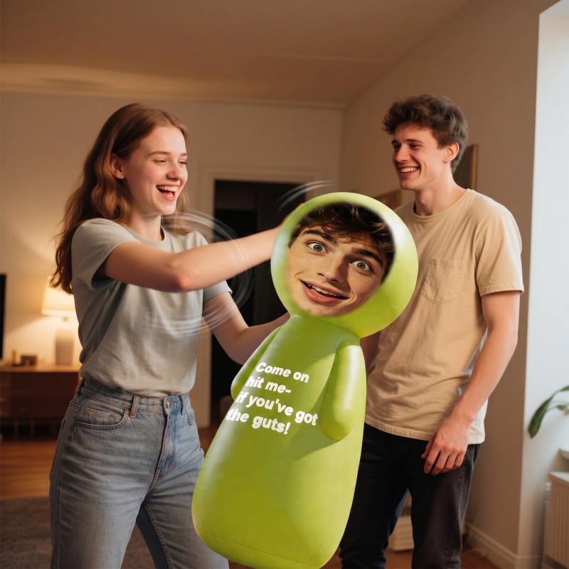 Add fun and personality to any space with this giant, personalized rocking doll. This custom floor doll features a cartoonish full-body design, realistic facial details, and a weighted round base for a playful rocking motion. It's the perfect gift, event decoration, and social media photo opportunity.