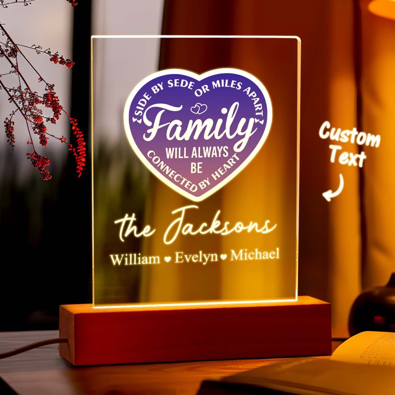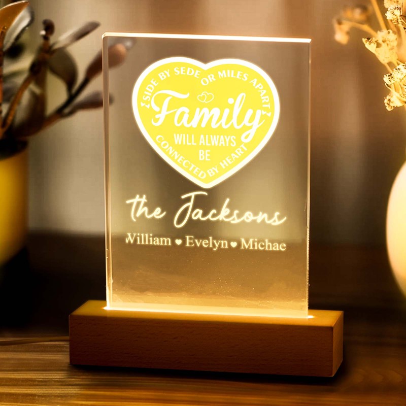 Personalized Family Will Always Be Connected By Heart LED Night Light with 1-5 Names and Wooden Base Housewarming Farewell Gift for Family